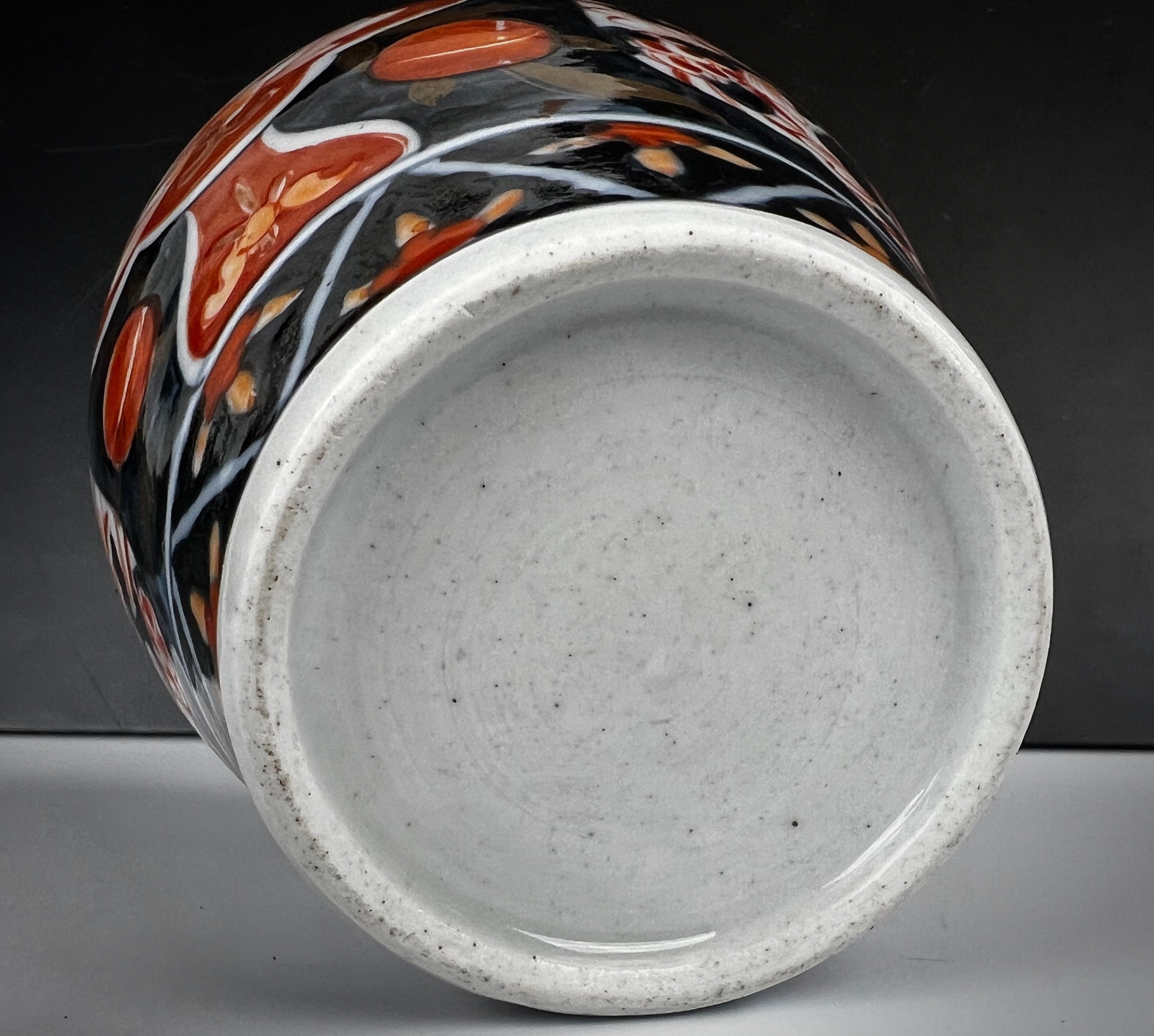 CHINESE STYLE TEMPLE JAR WITH LIDBlue, white, and orange imari type decorationChip to lid rim and one chip inside edge of bodyUnmarked Measures 8" tallSOLD AS IS