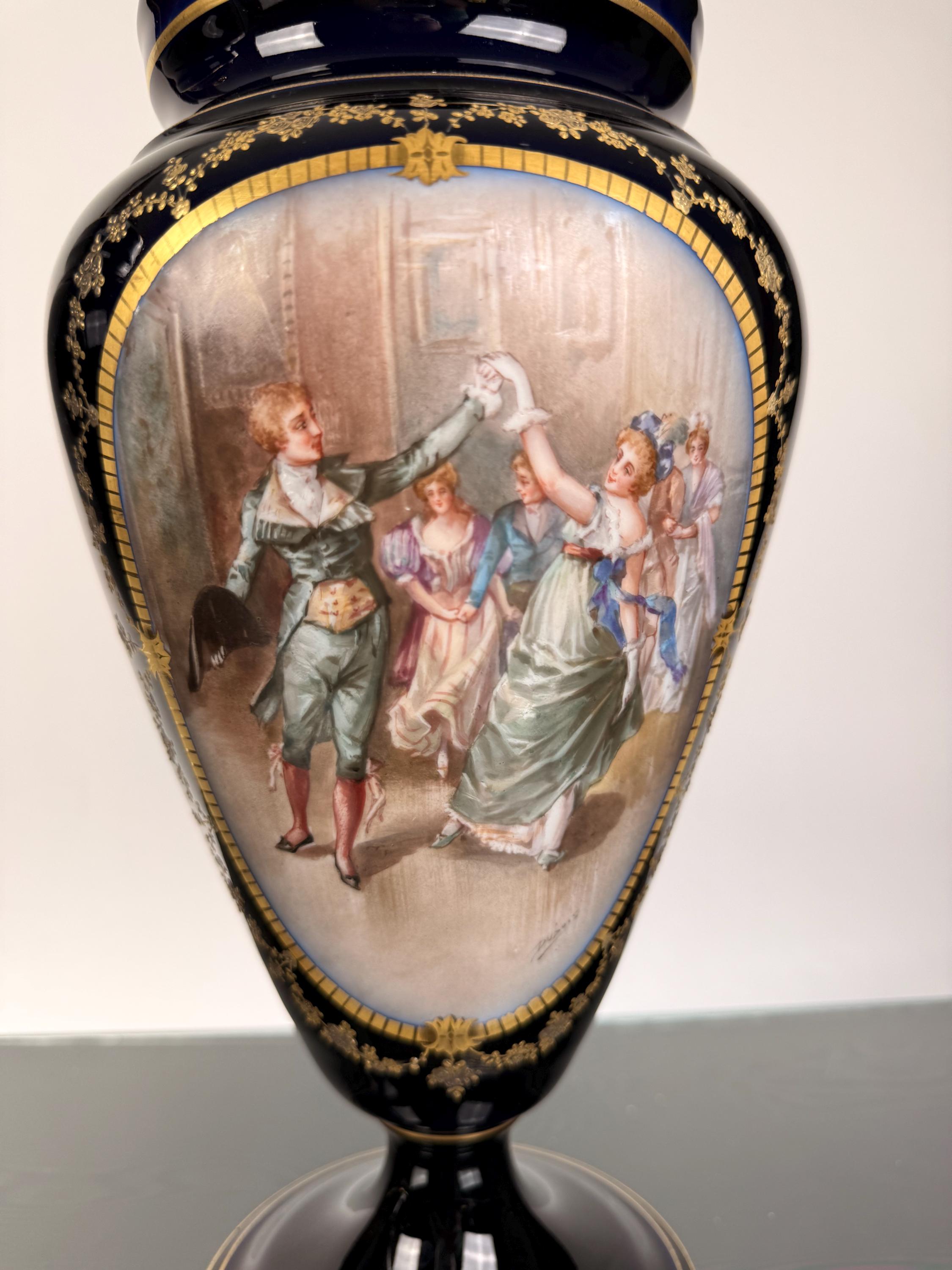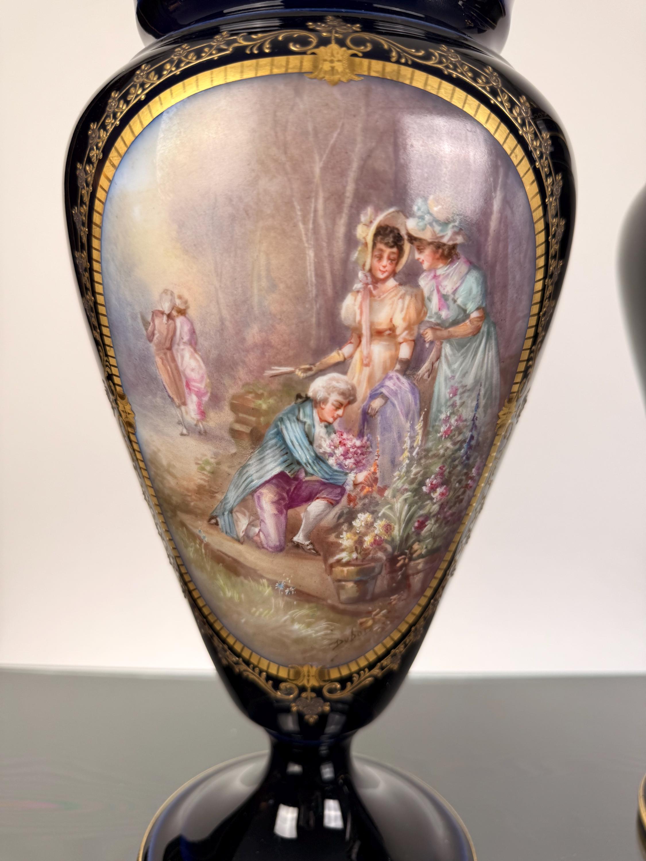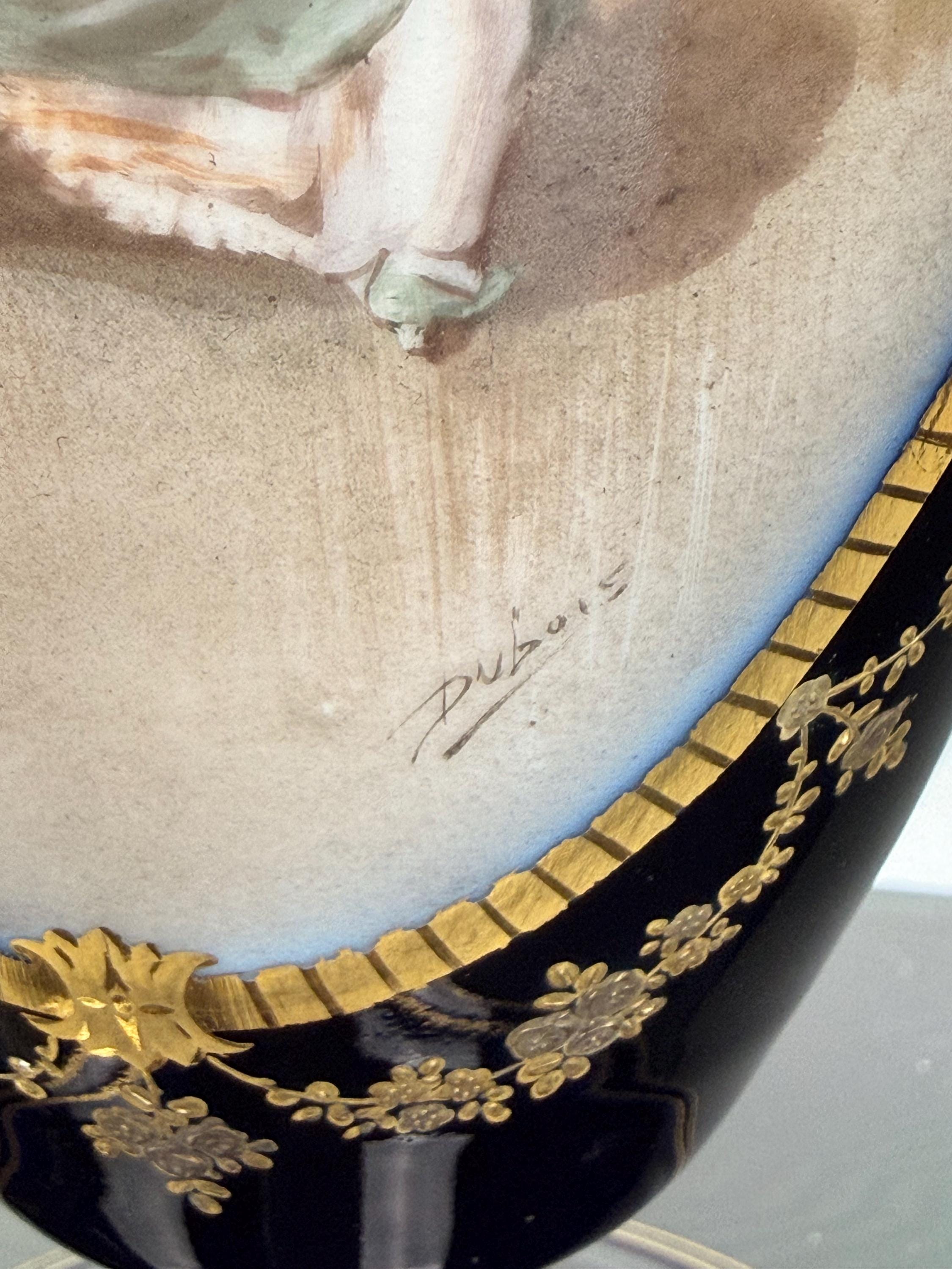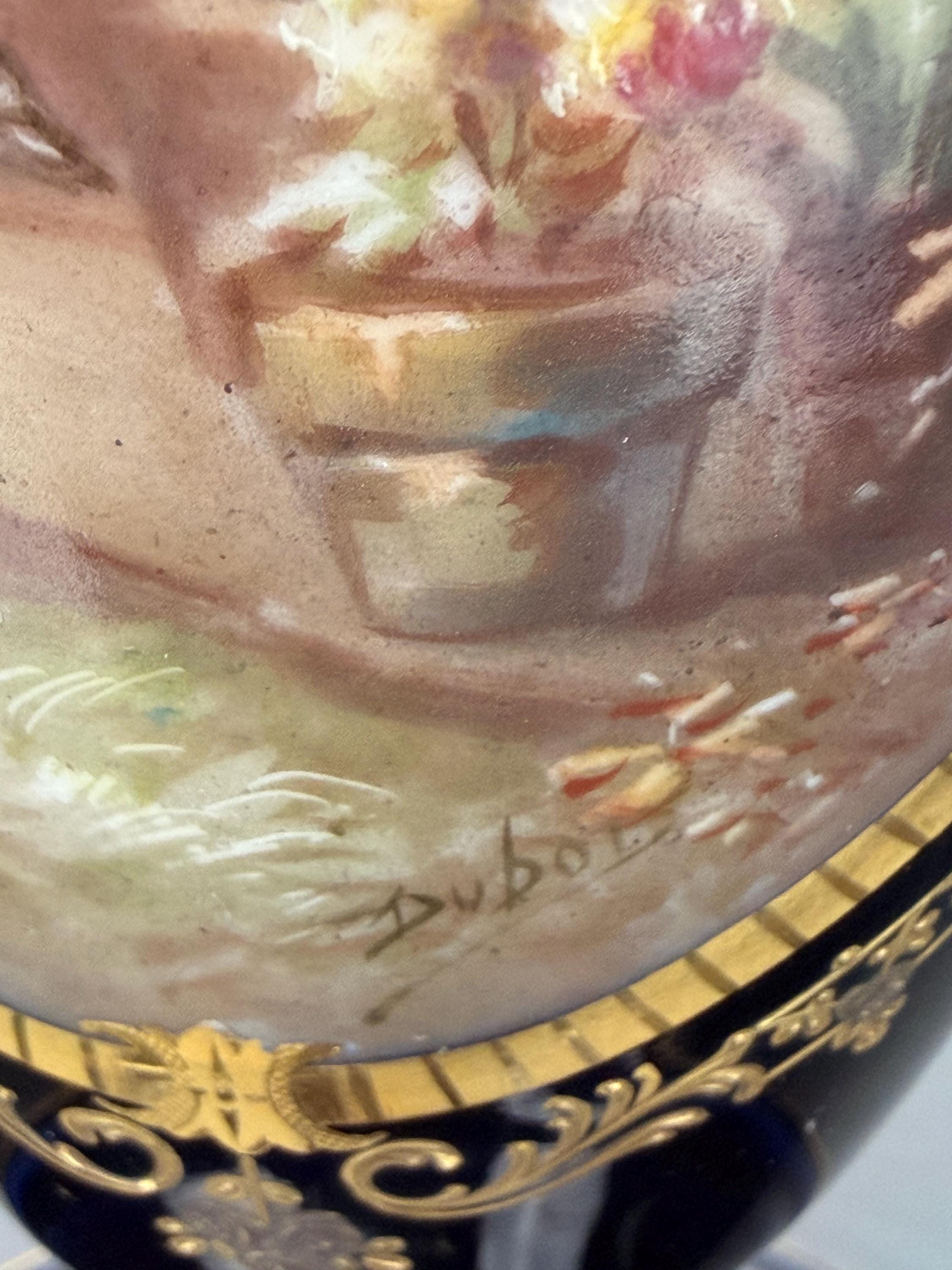 Gorgeous hand painting by artist DUBOIS - both signed - lovely ceramic potpourri urns complete with reticulated lid. Lots of raised gold decorate the edges of paintings and pen edges. Scenes are of French courting couples - one a partial scene and the other taking place at a dance. Rich deep cobalt blue glaze. Both signed as in the pictures. Pieces measure 15.5” tall with lids in place.