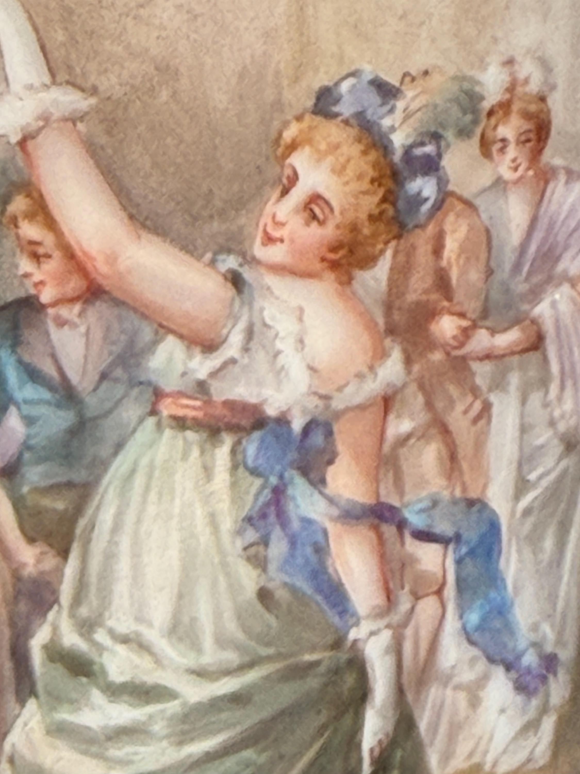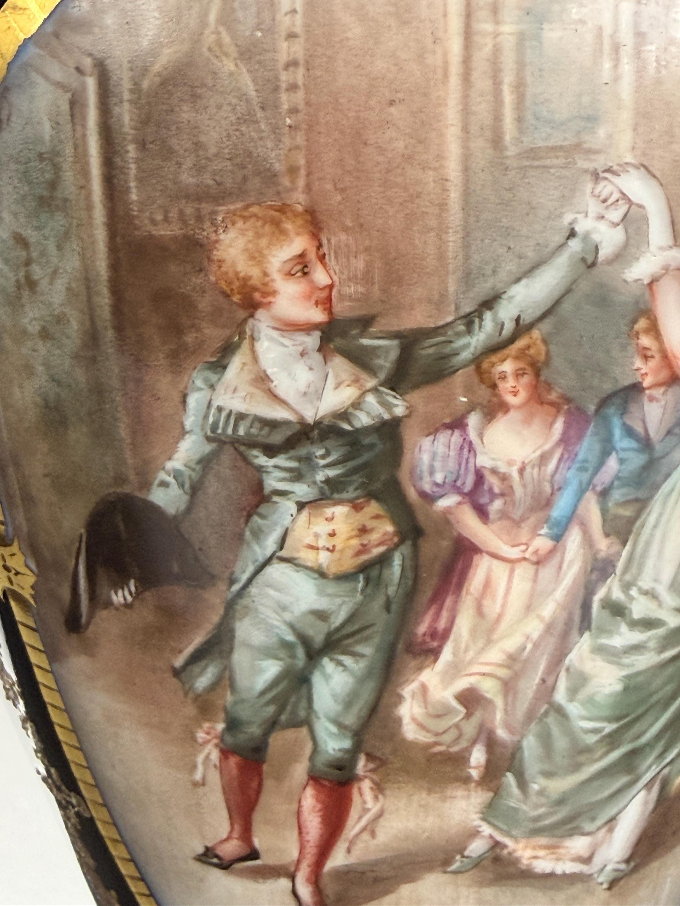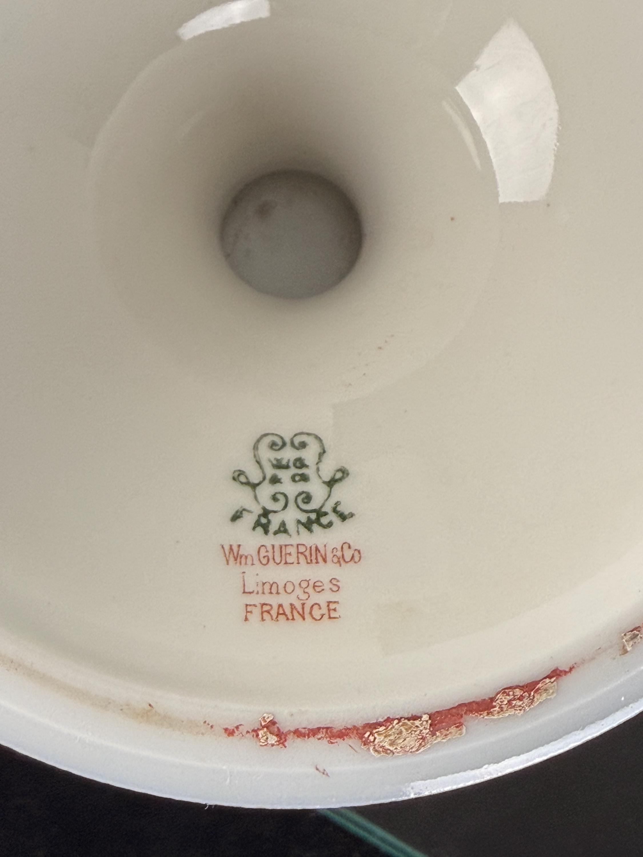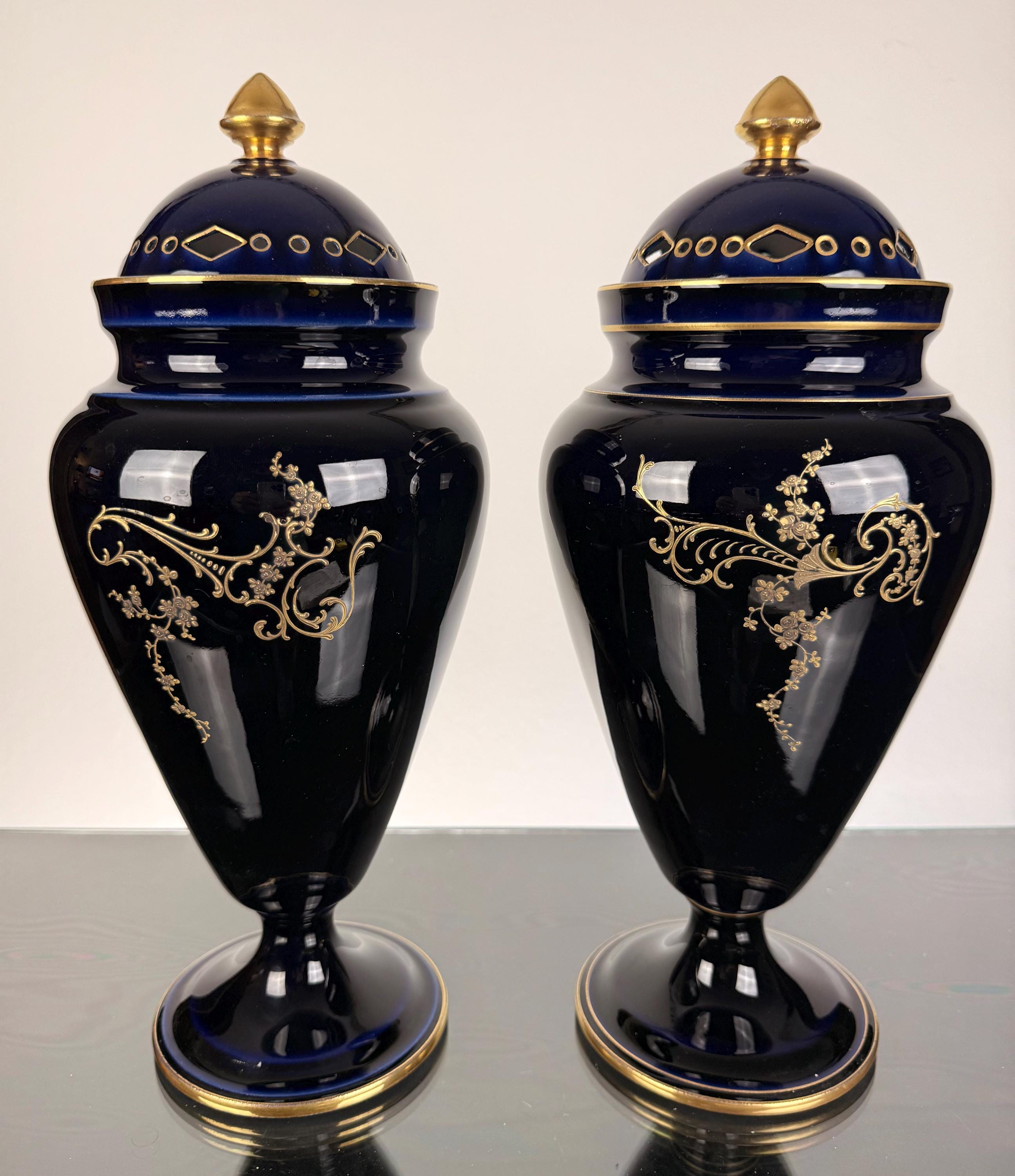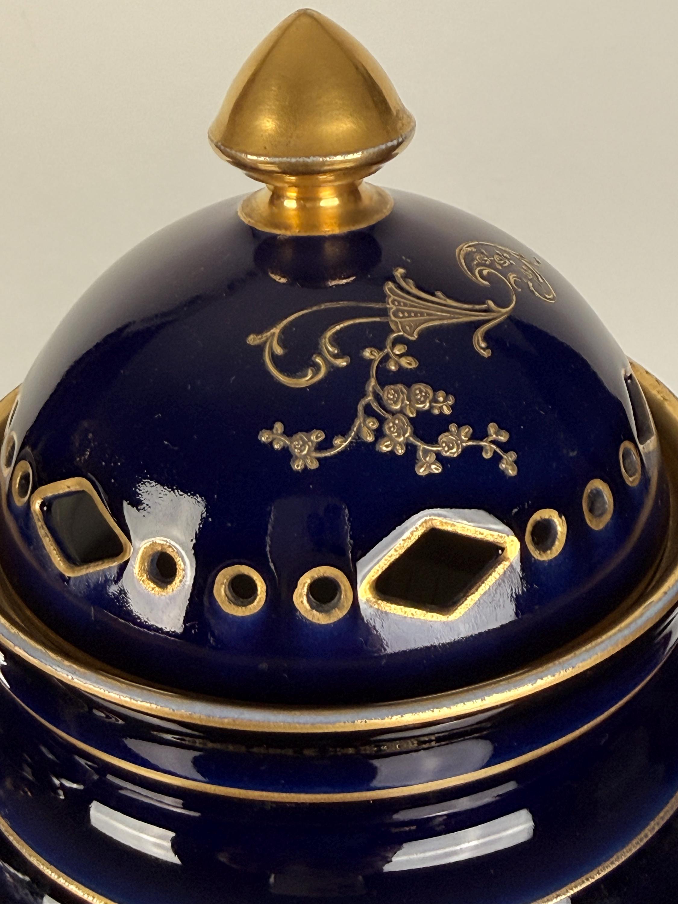 Gorgeous hand painting by artist DUBOIS - both signed - lovely ceramic potpourri urns complete with reticulated lid. Lots of raised gold decorate the edges of paintings and pen edges. Scenes are of French courting couples - one a partial scene and the other taking place at a dance. Rich deep cobalt blue glaze. Both signed as in the pictures. Pieces measure 15.5” tall with lids in place.