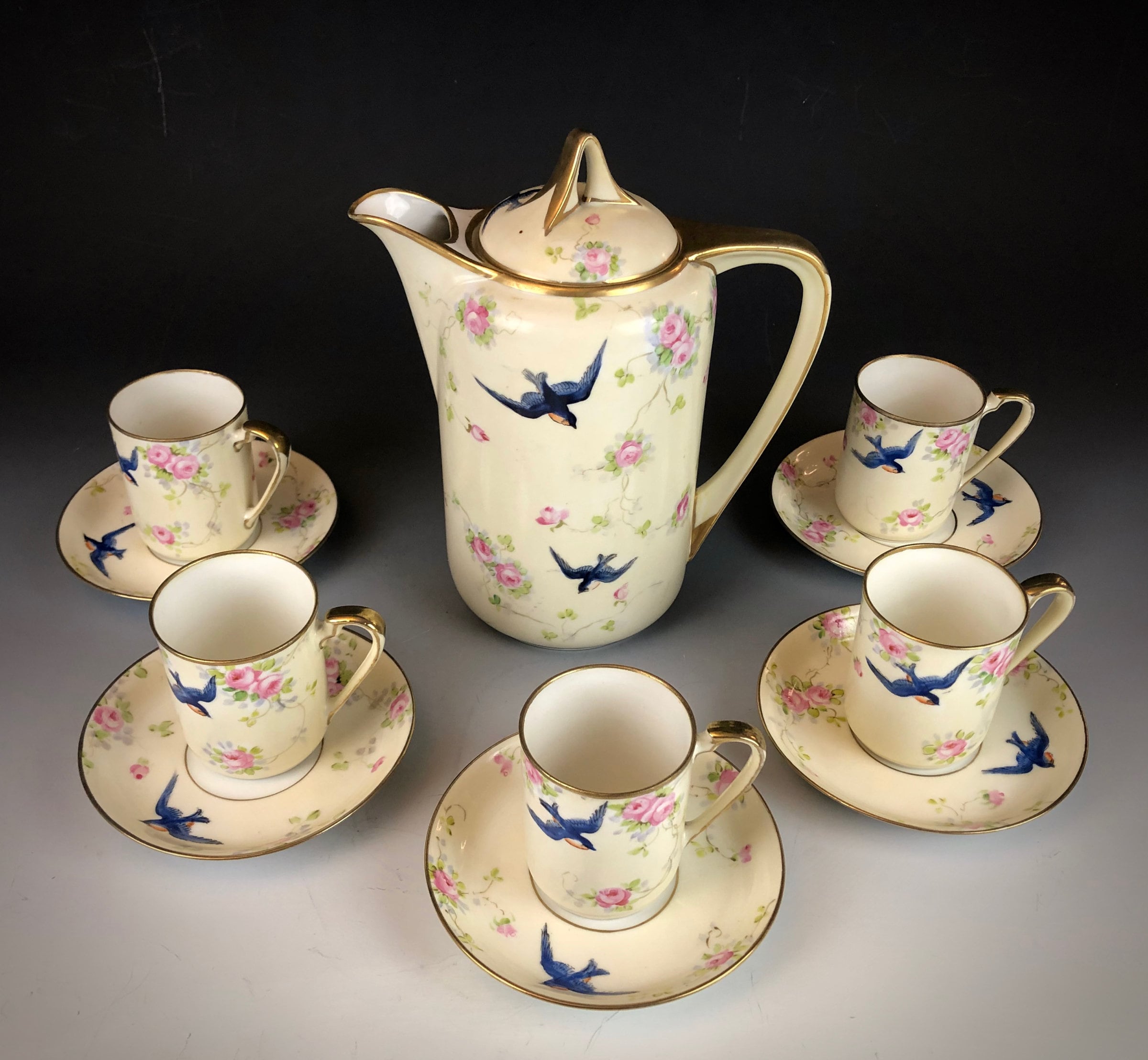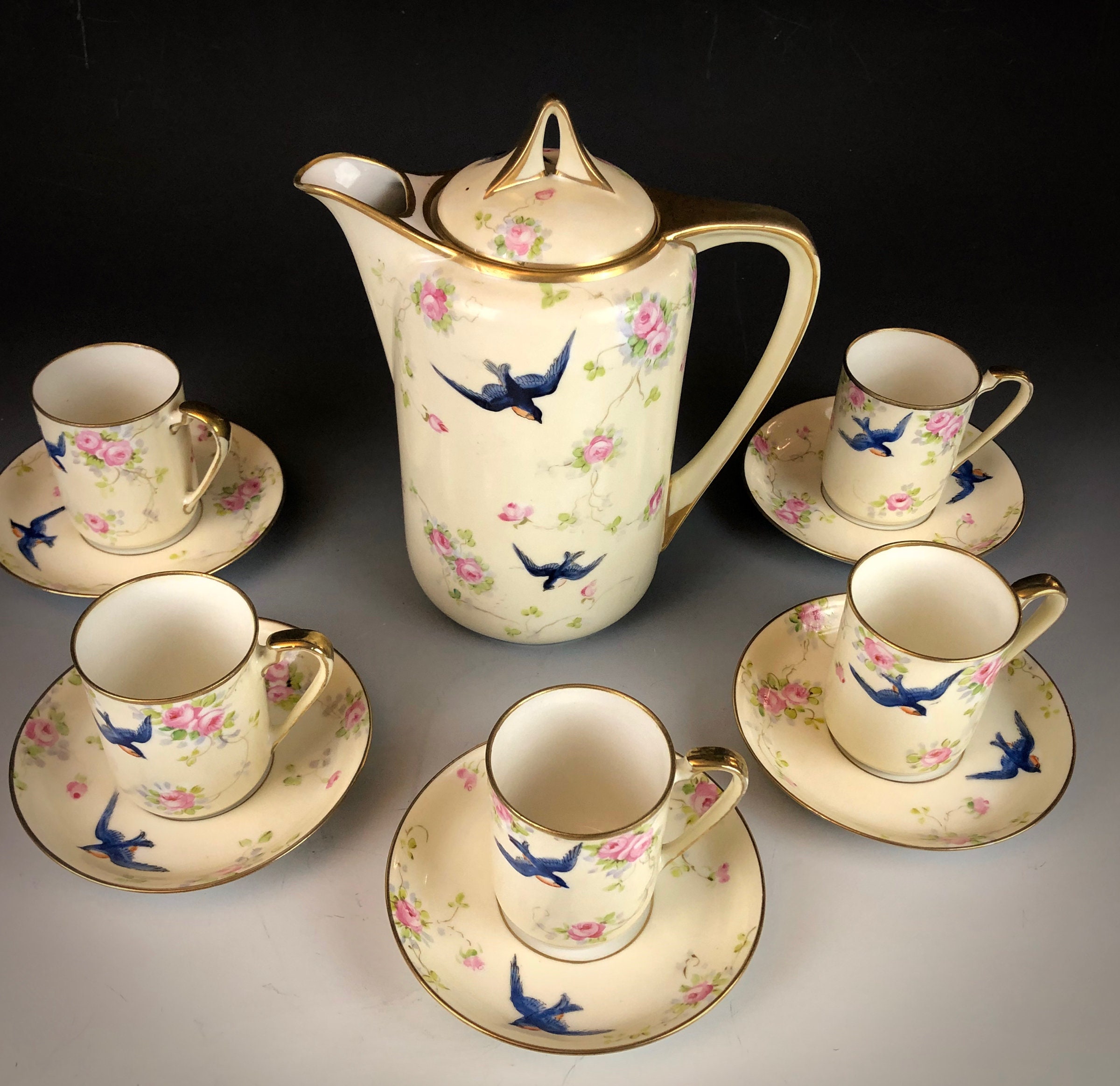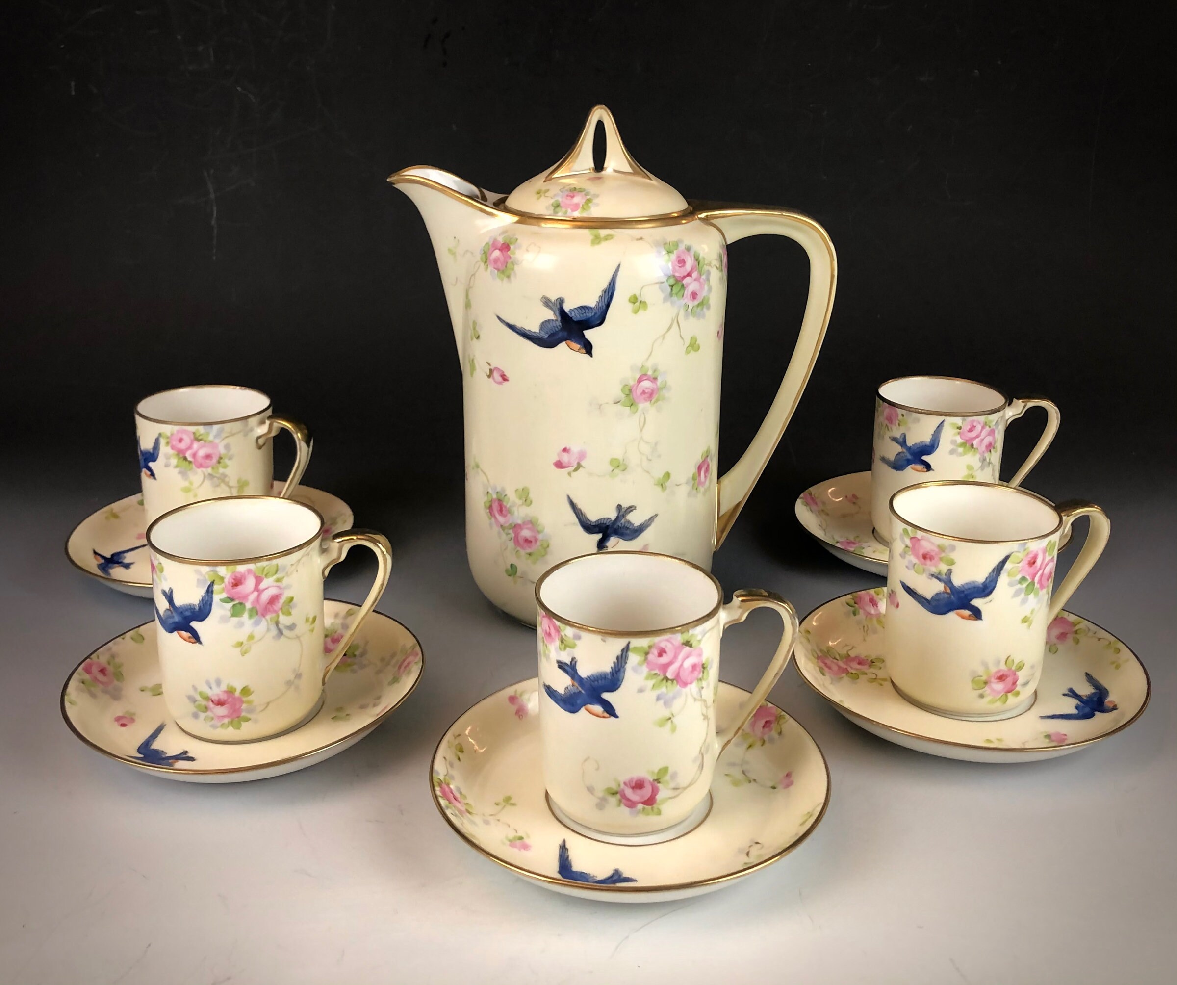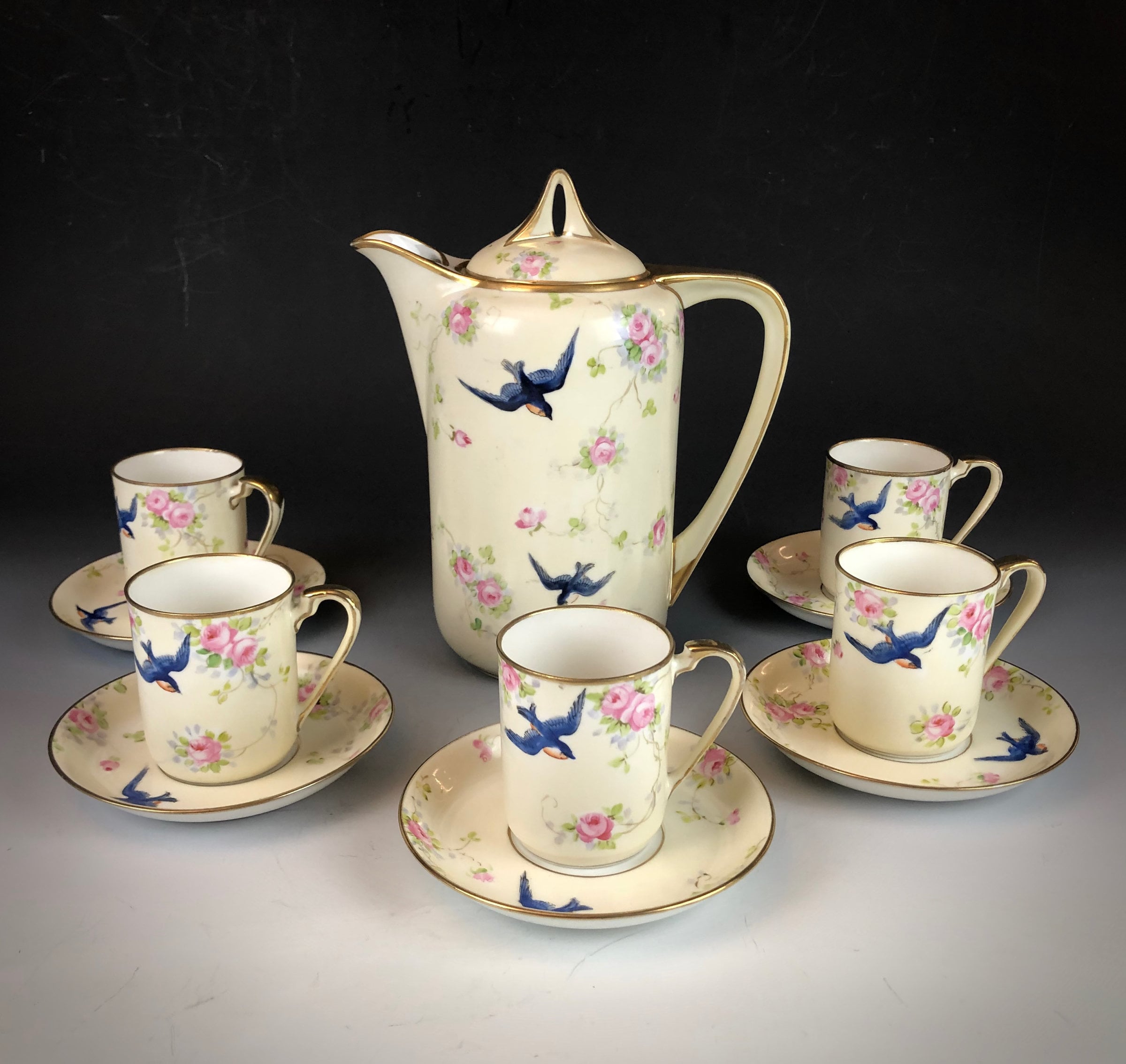 Hand painted with a design of blue swallows and pink roses
