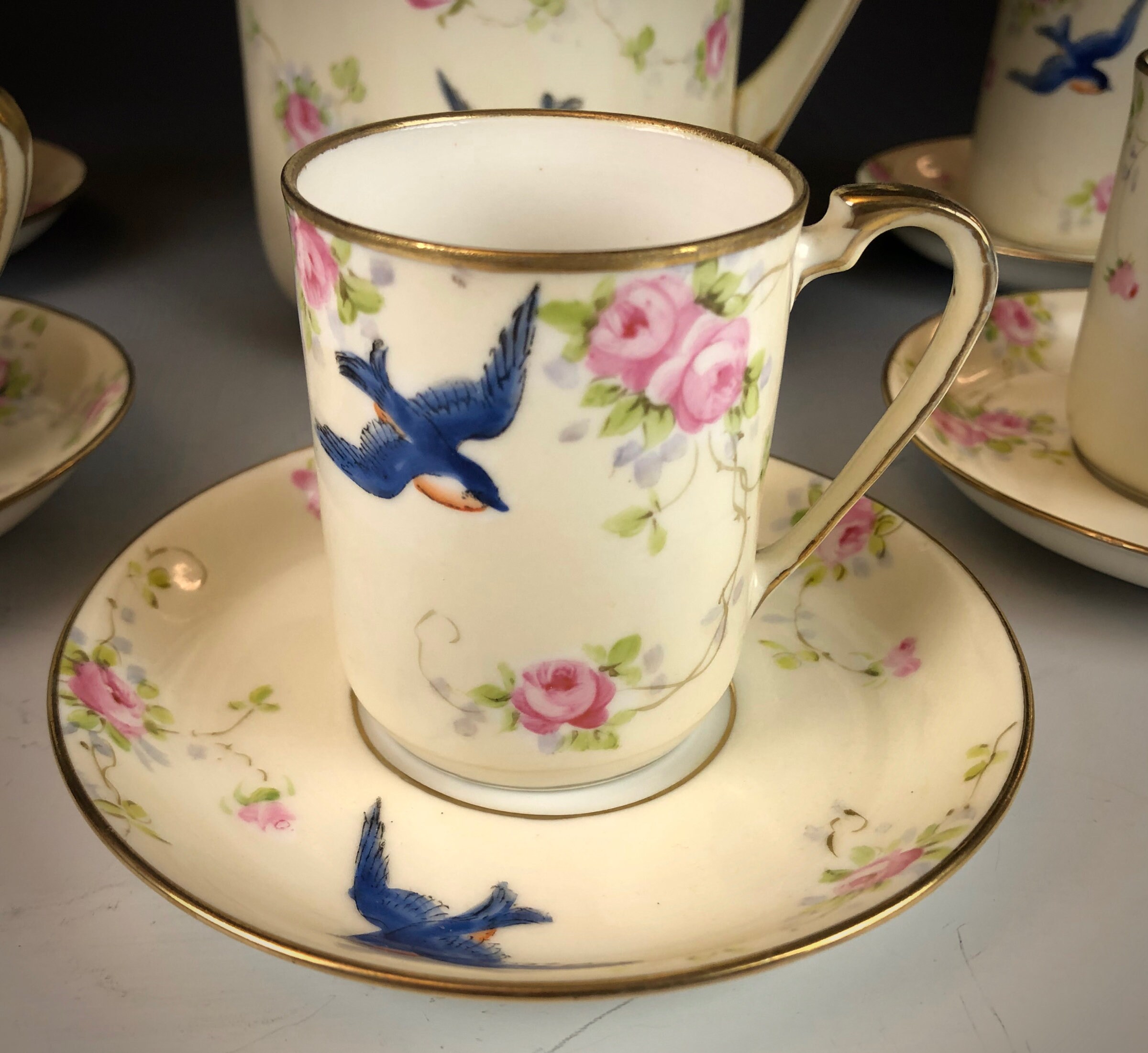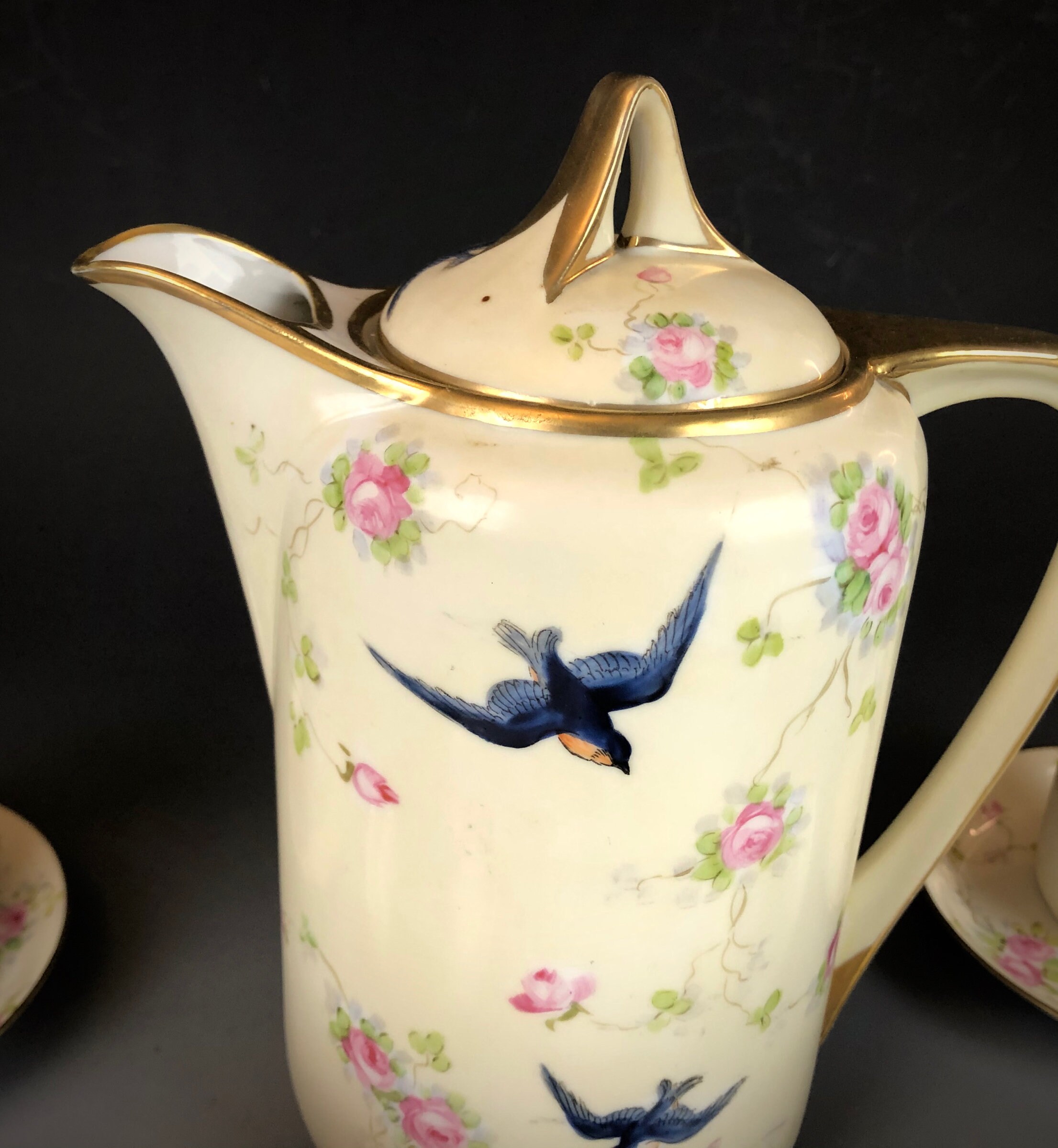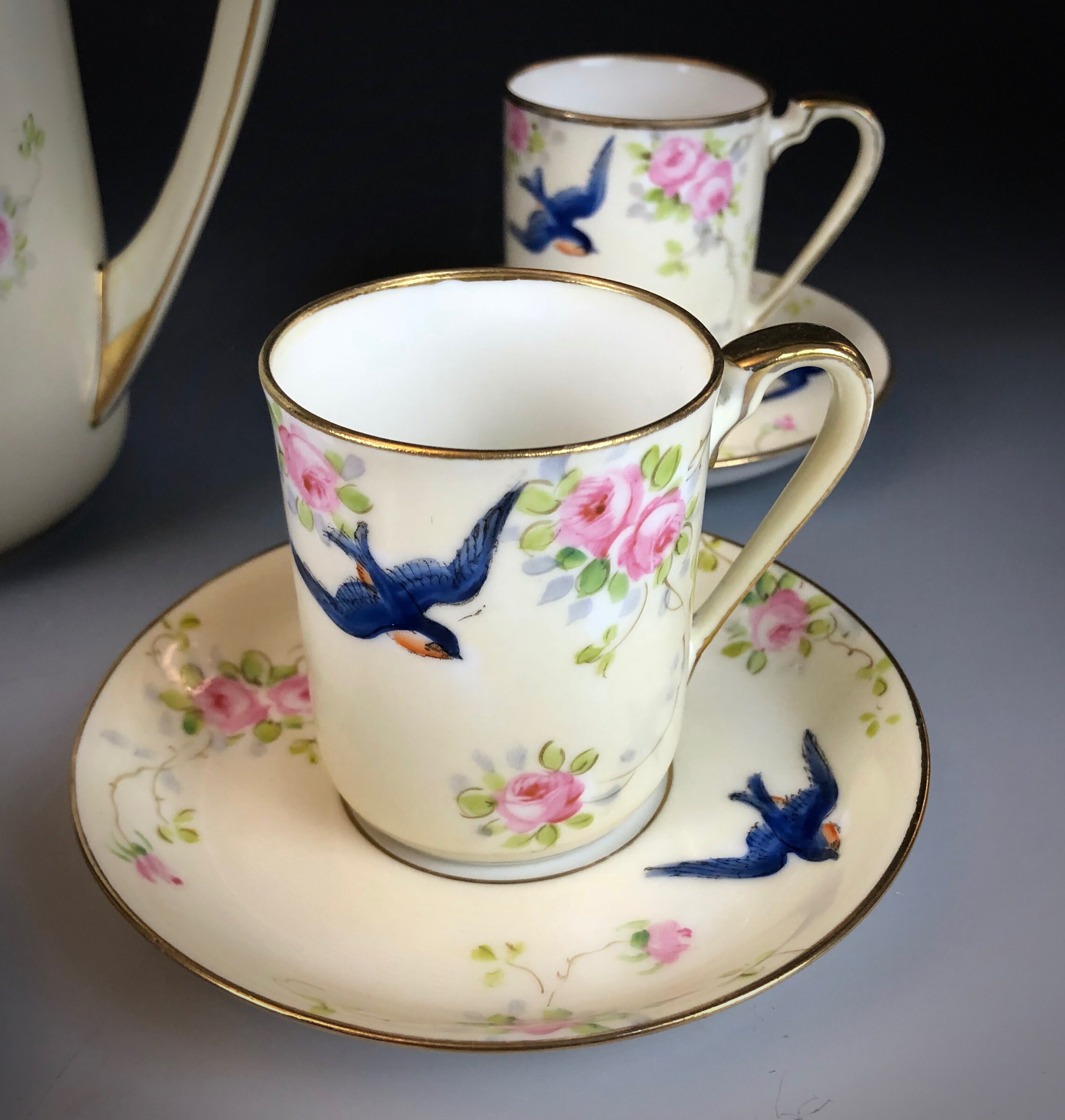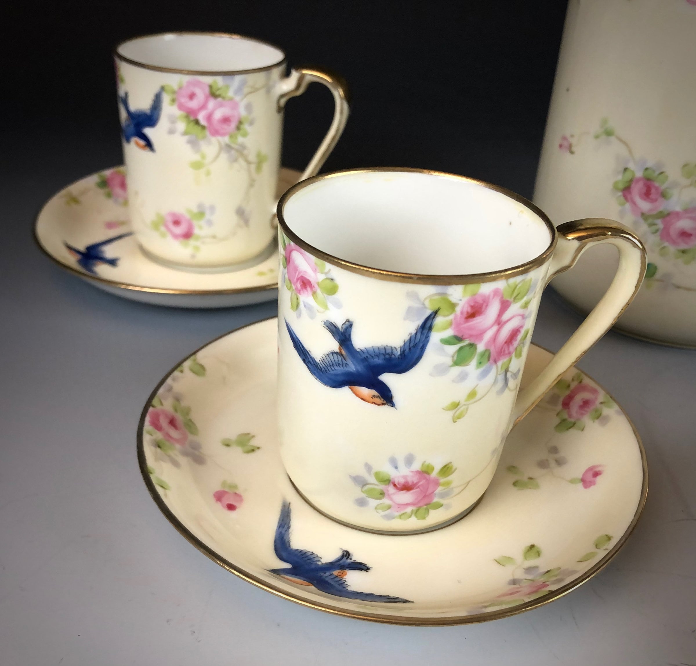 Hand painted with a design of blue swallows and pink roses